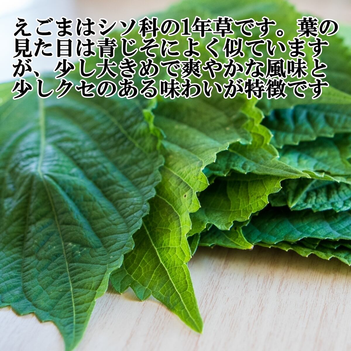 えごまはシソ科の1年草です。葉の見た目は青じそによく似ていますが、少し大きめで爽やかな風味と少しクセのある味わいが特徴です。