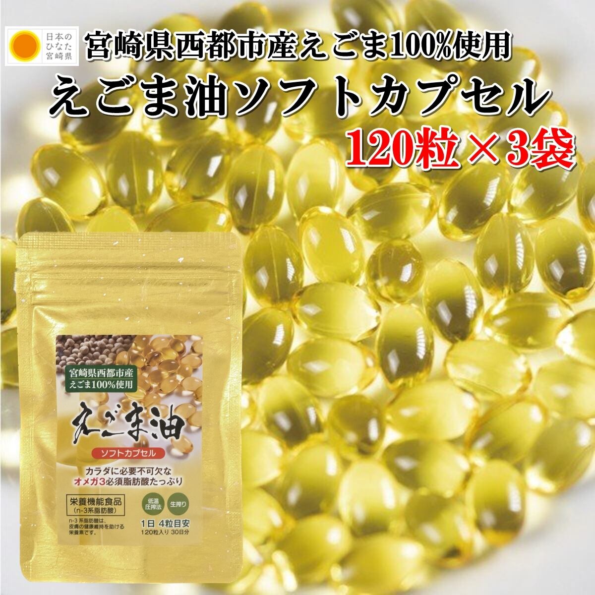 【送料無料】えごまソフトカプセル 120粒×3袋 国産 宮崎県産 西都市産 オメガ3必須脂肪酸 栄養機能食品 低温圧縮法 生絞り 1日4粒目安 30日分 グルメ プレゼント ギフト お取り寄せ おうち時間 【当店オススメ】【 お買得】 | 日本のひなた 宮崎特産市場