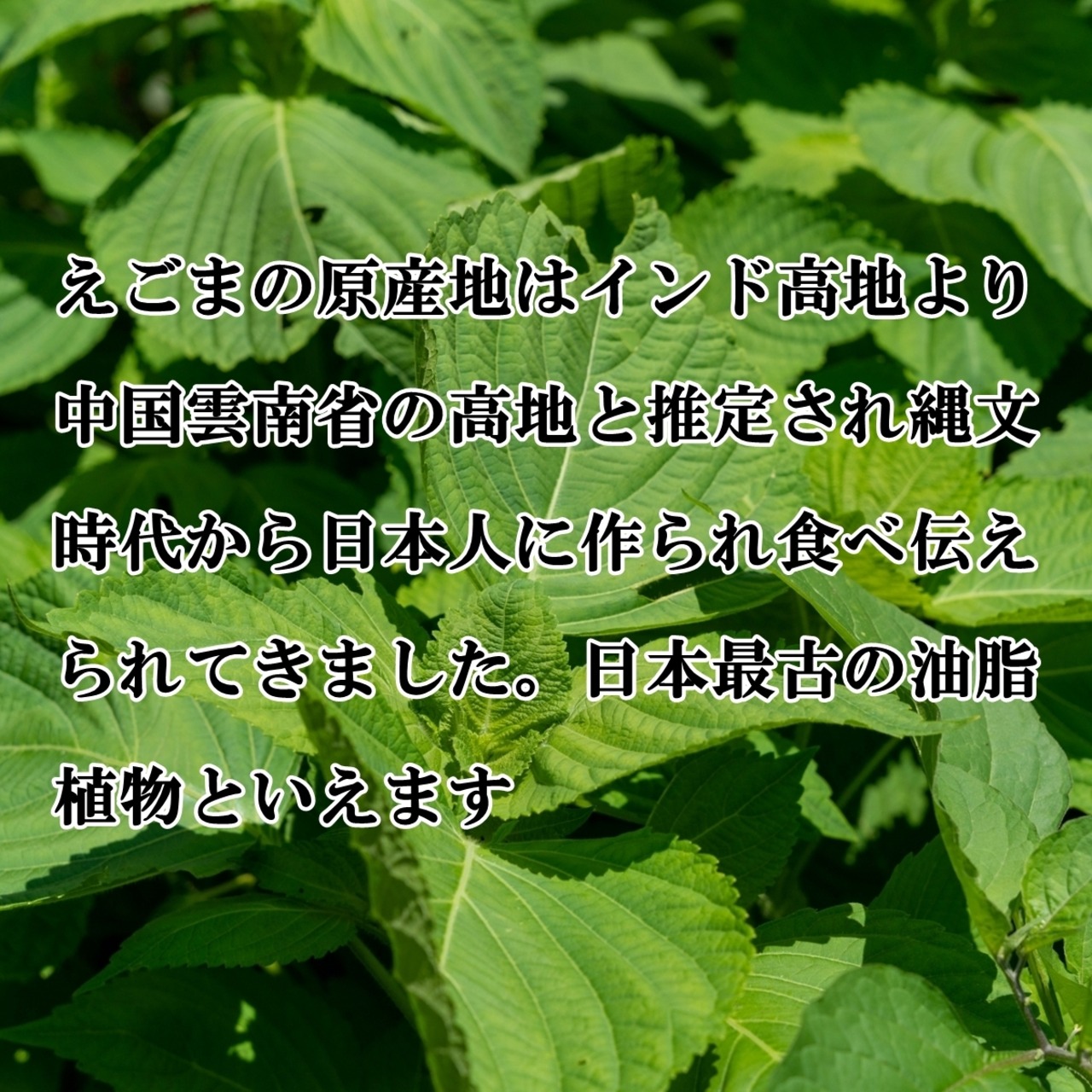 えごまの原産地はインド高地より中国雲南省の高地と推定され、ここから中国、韓国、日本に入ったといわれ1万年~5500年前の縄文時代から日本人に作られ食べ伝えられてきました。その事からえごまは日本最古の油脂植物といえます。