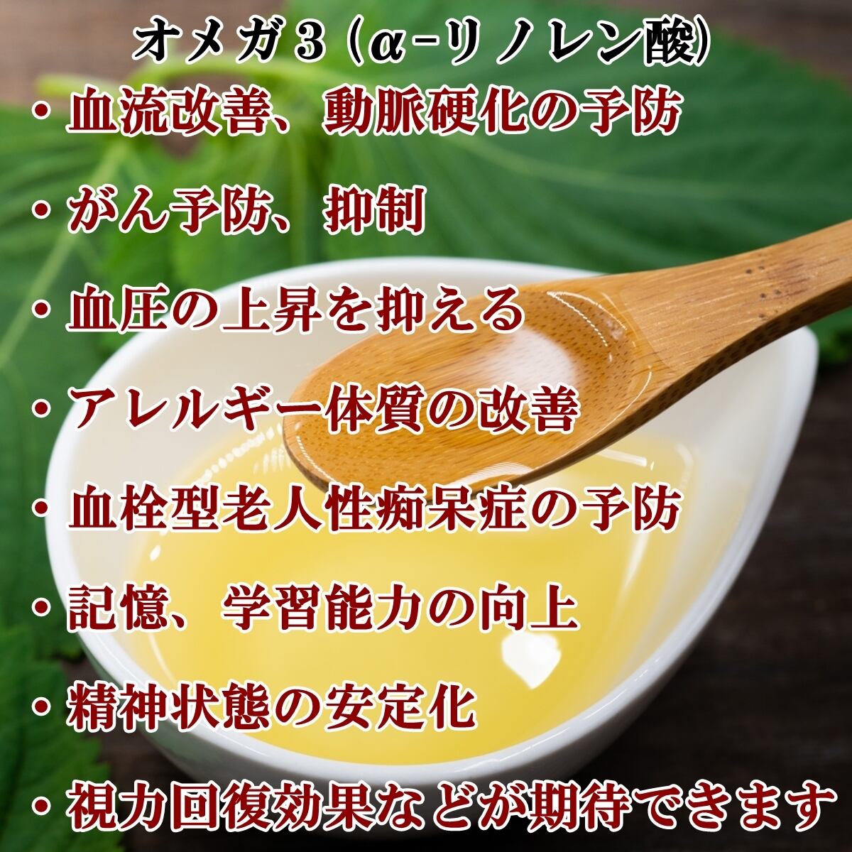 体内でEPAやDHAに変化し、血液をサラサラにする働きがあり、動脈硬化や心臓病を予防し、男性機能を向上させ、子供の脳を発育させます。